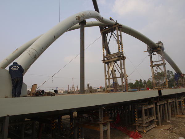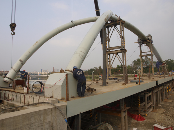 江油昌明河下游綜合整治項(xiàng)目明月橋?yàn)楫愋怨袄咪撓淞簶颍摴こ涛挥诮褪刑芥?zhèn),整個(gè)鋼箱梁及拱肋鋼結(jié)構(gòu)專業(yè)的工程量約為470噸,其中鋼箱梁跨度為72.6米,寬度11米。
